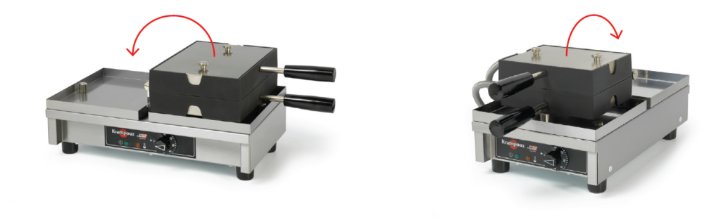 Sur les gaufriers 180°, il existe deux orientations possible pour l’ouverture : de gauche à droite ou d’avant en arrière. Les performances du gaufrier ne sont pas concernées, ce choix se fait uniquement selon l’ergonomie du poste de travail. Sur un plan de travail peu profond, préférez l’ouverture de gauche à droite.