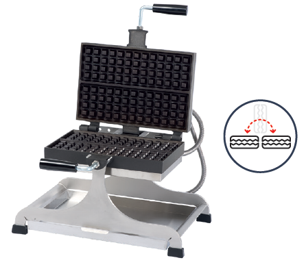 • Parfaite répartition de la pâte sur les deux plaques grâce au système de basculement gauche-droite ou avant-arrière des fers.
