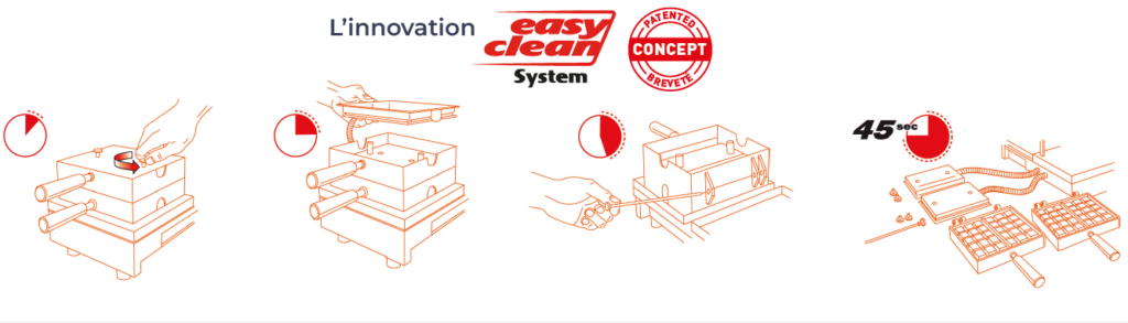 Le Système Easy Clean permet le démontage instantané des fers, facilitant ainsi leur nettoyage et celui de l’ensemble des éléments.