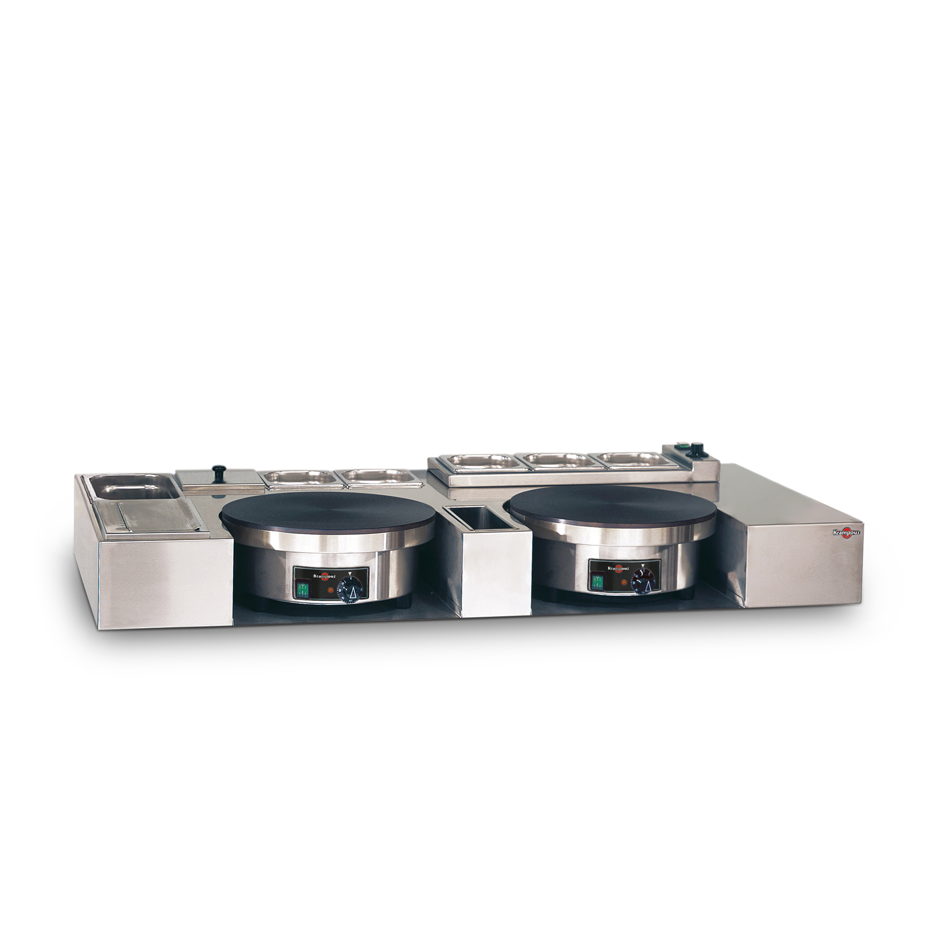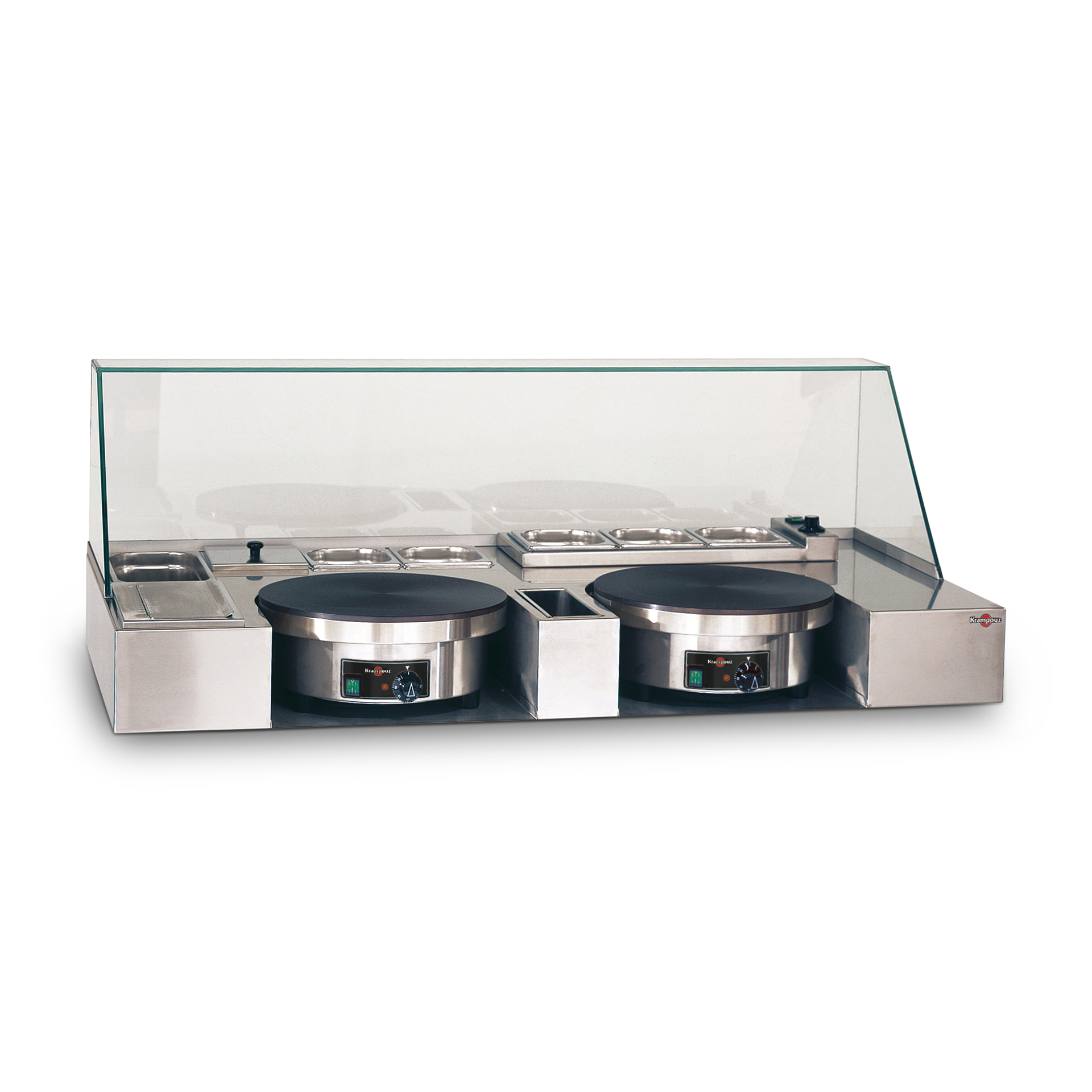 See allThe fixed working top is used with two 40 cm diameter professional electric crepe makers.