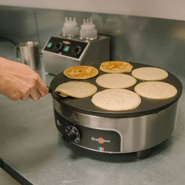 Grâce à son manche ergonomique, la prise en main est sûre et agréable, même à proximité d’une plaque chaude. Un gain d’efficacité et de rapidité : un simple coup de poignet suffit pour retourner les pancakes dans l’empreinte sans toucher les autres pancakes en cours de cuisson.