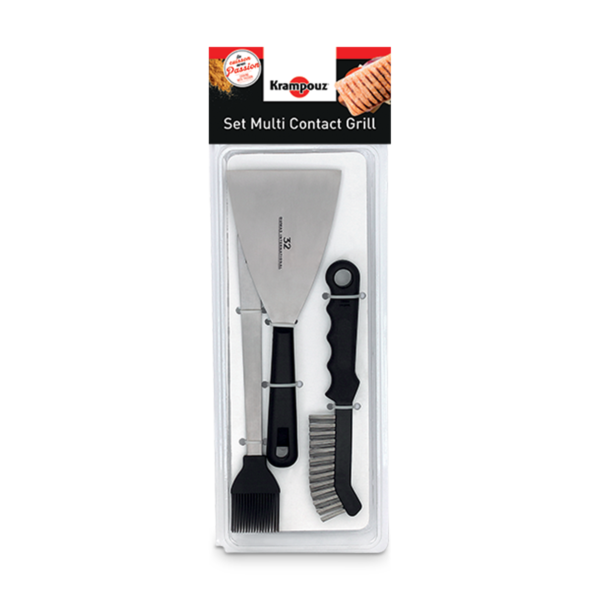 Le set d’accessoires pour contact grill ou appareil à panini est composé d’une spatule en inox pour retourner les préparations, d’un pinceau en silicone pour graisser les fers et d’une brosse en inox pour nettoyer les fers.
