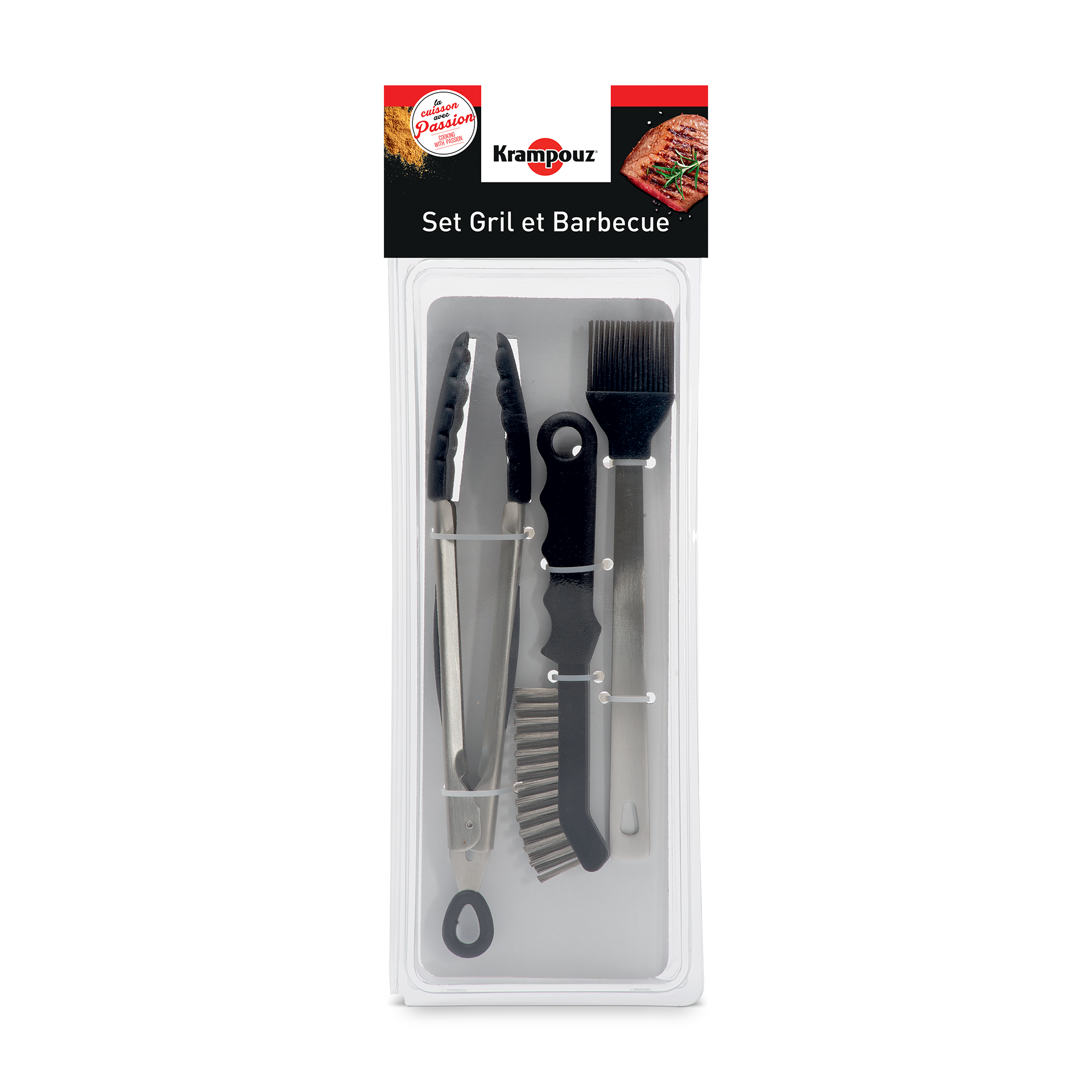 Le set d’accessoires pour gril est composé d’une pince en silicone pour retourner les viandes, d’un pinceau en silicone pour graisser la plaque et lustrer les préparations ainsi que d’une brosse en inox pour nettoyer la plaque.